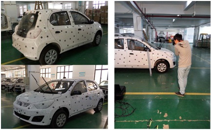 流程: 以下圖掃描整車為例,首先,為整車布點(diǎn),并用全局?jǐn)z影測量系統(tǒng)獲取標(biāo)記點(diǎn)的空間三維數(shù)據(jù)。